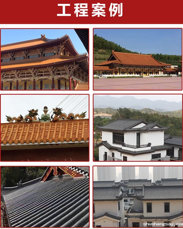 琉璃筒瓦:黄釉色的琉璃筒瓦适用于寺庙、寺院的房面装饰,也用于唐式、明清、京派古建的房面装饰等